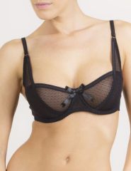 Szivacs nélküli, áttetsző puha tüll anyagú, merevítős melltartó. Szatén pánttal és masnival díszítve. Hátulján két soros, három kapcsos záródás.