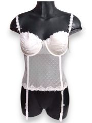 Elegáns TRIUMPH tüll fűző fehér színben, formázott kosárral, lekapcsolható pántokkal és harisnyatartóval. Ideális alkalmi viselethez és különleges megjelenéshez.