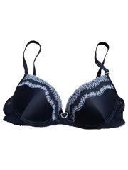 Merevítős, push up szivacsos, selymesen fényes, fekete színű hímzett melltartó, hátpántja csipkés két soros és két kapcsos. Mellrészénél elől középen egy szív alakú dísz kövekkel kirakva.