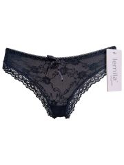 Finoman áttetsző, virágmintás csipkével díszített Lemila bugyi, amely tökéletesen ötvözi a nőies megjelenést és a kényelmet. Klasszikus fazon, csípőig érő kialakítással.