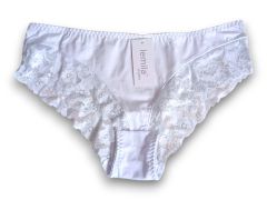 Csípőig érő, csipkés fehér francia fazonú női bugyi.