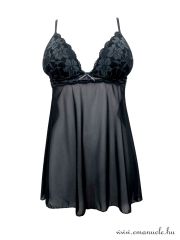 Fekete, pöttyös mintájú Khimera tüll babydoll mély hátkivágással és állítható tangával. S/M méretű, elegáns és érzéki magyar fehérnemű szett.